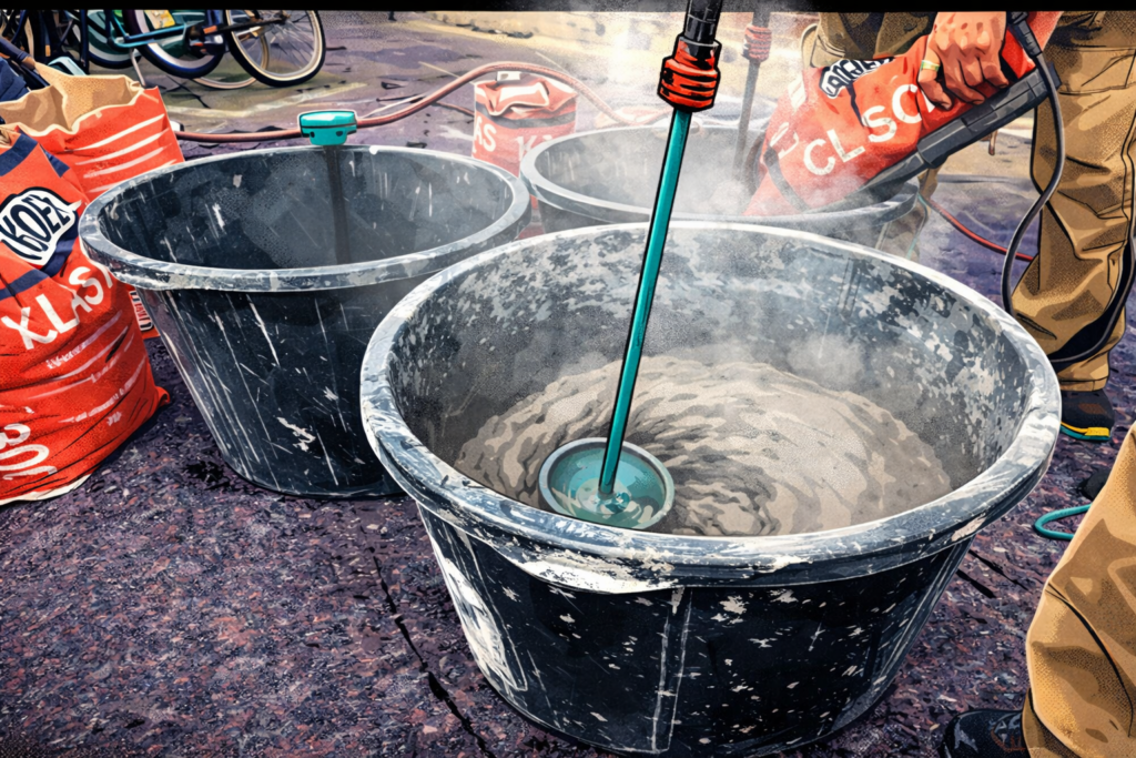2. Masse einrühren Gib das Pulver langsam ins Wasser (nicht umgekehrt, Klumpenbildung!) und rühre mit dem Rührquirl an der Bohrmaschine durch, bis eine klümpchenfreie, cremige Konsistenz entsteht.