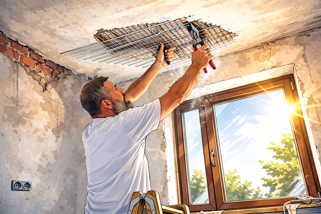 Ziel ist es, dass das Streckmetall absolut fest an der Decke befestigt ist, damit sich der neue Deckenputz nicht wieder lösen kann.