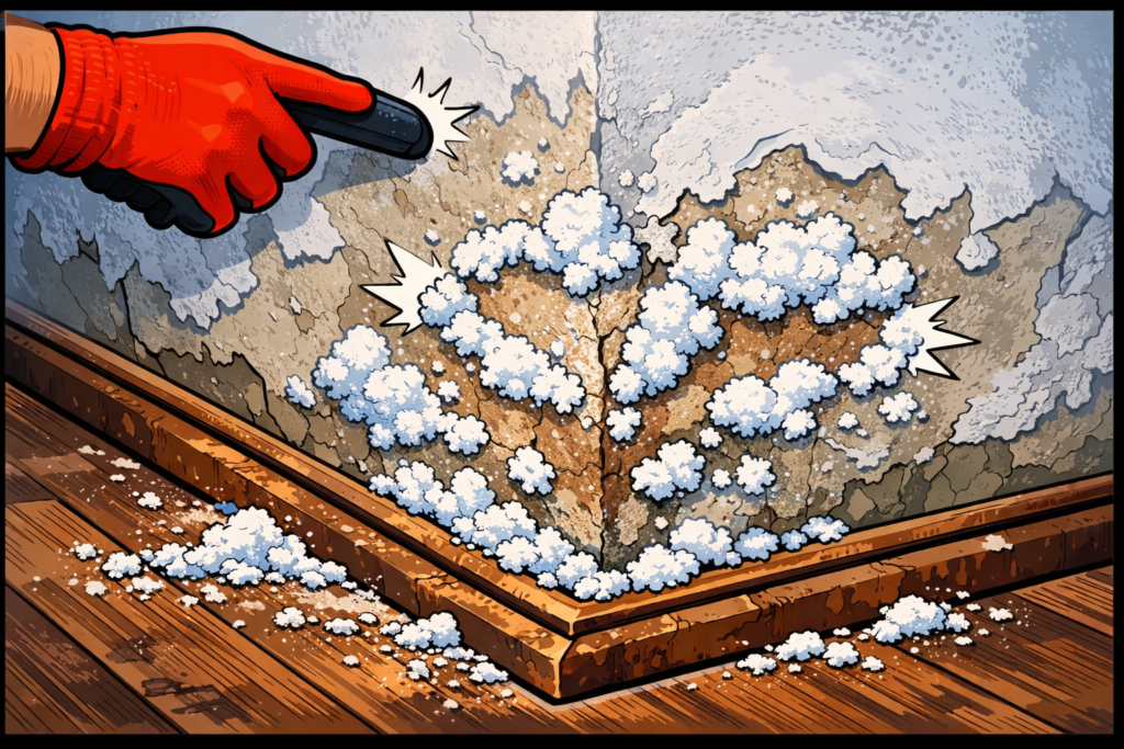 Diese weißlichen Ablagerungen zerstören die Haftung von Putzen und Abdichtungen. Deshalb muss ein Salpeter-Entferner vor dem Abdichten aufgetragen werden, um die chemische Zusammensetzung der Wandoberfläche zu neutralisieren.