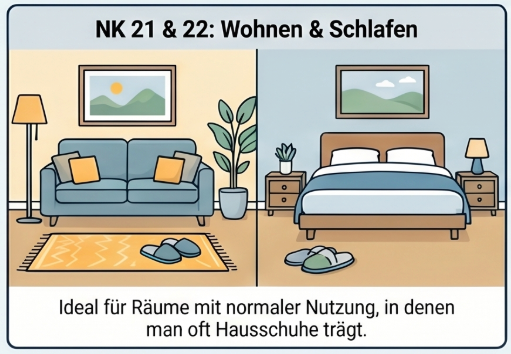- NK 21 (Mäßige Nutzung): Ideal für Räume, in denen du meistens Hausschuhe trägst und dich wenig aufhältst, wie zum Beispiel im Gästezimmer oder Schlafzimmer.