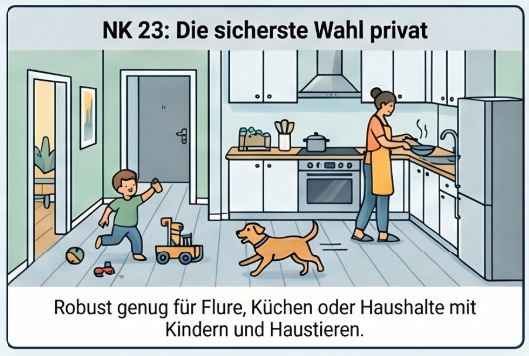 - NK 23 (Starke Nutzung): Hier wird es robust. Diesen Boden solltest du in Bereichen verlegen, die direkt von außen betreten werden, wie den Flur oder die Küche. Auch wenn Kinder oder Haustiere im Haus sind, ist das die sicherste Wahl für den Privatbereich.