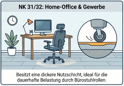 - NK 31/32 (Gewerbliche Nutzung): Diese Böden haben eine deutlich dickere Nutzschicht (meist ab 0,4 mm bis 0,55 mm). Viele Heimwerker greifen auch privat zu NK 32, wenn sie einen Boden wollen, der „ewig“ hält – zum Beispiel im Home-Office mit einem Bürostuhl mit Rollen.