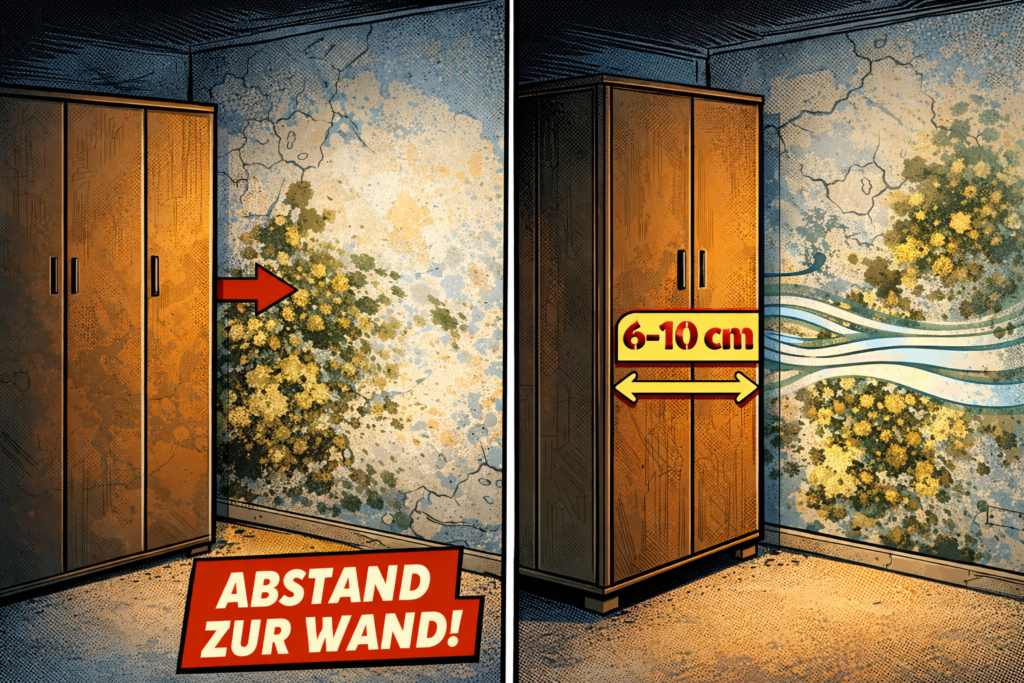 Schritt 7: Möbel von der Außenwand wegrücken Große Schränke oder Regale direkt an der Außenwand sind eine häufig unterschätzte Schimmelursache. Dahinter kann die Luft nicht zirkulieren, die Wand kühlt aus und die Feuchtigkeit staut sich.